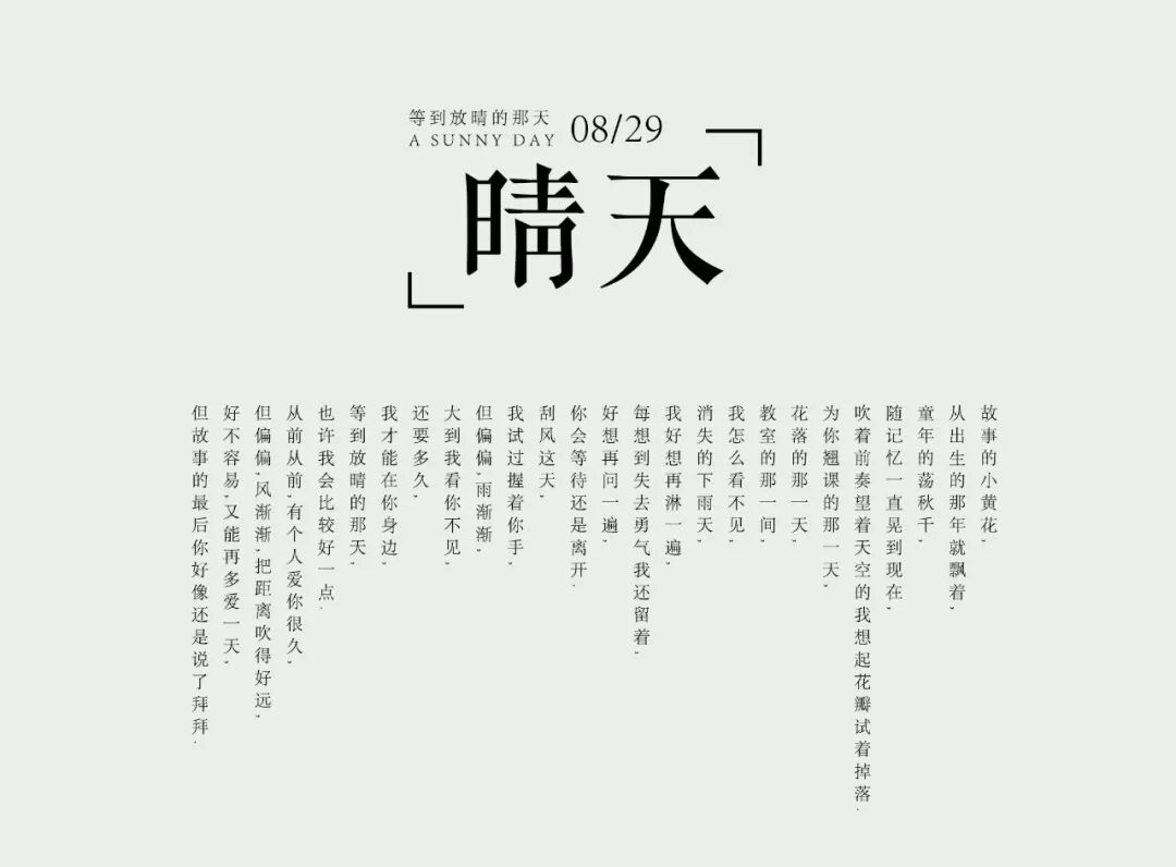 怎么樣?是不是感覺發(fā)現(xiàn)了新大陸?這樣的排版很適合水墨風(fēng)格,那做出來的文字排版設(shè)計(jì),簡直是一股排版界的清泉石上流,各位設(shè)計(jì)師們平時(shí)想不到怎么排版的話,不妨試試這種風(fēng)格,說不定更受歡迎哦。