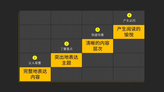 第一部分是完整地表達(dá)內(nèi)容,第二部分是突出地表達(dá)主題,第三部分是清晰的內(nèi)容層次,第四部分才是產(chǎn)生閱讀的愉悅。