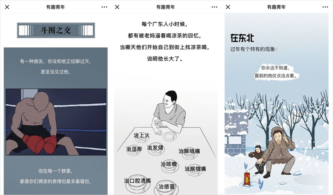 作為一個(gè)原創(chuàng)漫畫公眾號,「有趣青年」的內(nèi)容呈現(xiàn)不止于金句文案的創(chuàng)作,還有視覺漫畫的強(qiáng)大表現(xiàn)力。