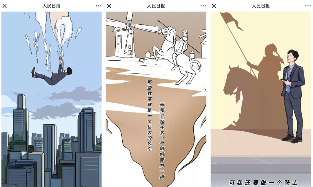 我們可以看到,在《“讀書其實(shí)沒有什么用”》這篇圖文的第一個(gè)場景中,通過人物靈魂的抽離,進(jìn)行現(xiàn)實(shí)空間與書中世界的切換,最后將自己昂首的姿態(tài)與堂吉訶德騎驢持槍的影子互相呼應(yīng),讓人感受到“我還要做一個(gè)騎士,向生活刺出長矛”的堅(jiān)定。