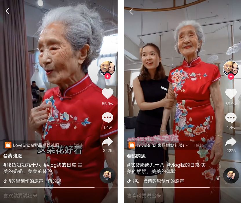 比如我們開頭提到的老年網(wǎng)紅九旬奶奶喻澤琴,她那耿直可愛的吃貨本性,也讓她俘獲了兩百多萬的粉絲。同時(shí)也被廣告商盯上了,找奶奶拍攝各種推廣視頻。從最新的動(dòng)態(tài)中,我們發(fā)現(xiàn)奶奶竟然“賣”起了婚紗。