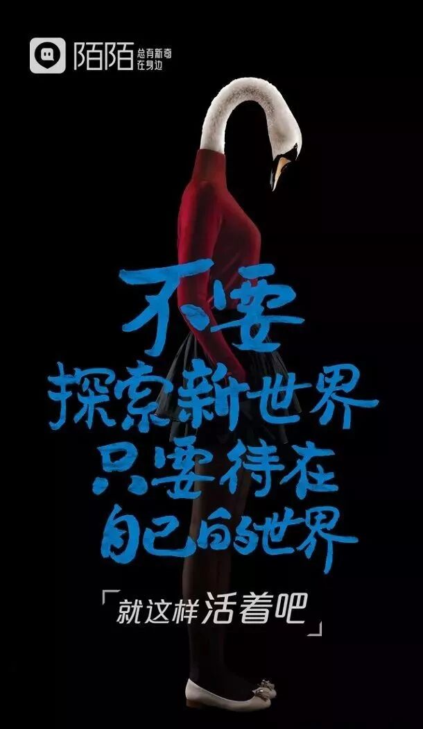 然后是陌陌《就這樣活著吧》系列海報(bào),以正話反說的形式,用5種動(dòng)物隱射出阻止人們逃離平淡生活、去遇見新奇的五大因素,引起年輕人群的共鳴: